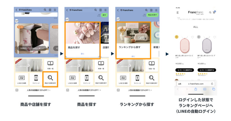 リッチメニューの「商品や店舗を探す」エリアは、ふとした時に触って楽しい設計を目指しました。商品を探す > ランキングから探す と進んでいくことで、LINEから商品のランキングページに遷移する設計にしています。LINEからサイトへ遷移する時に、(LINEのID連携がされている方は)LINEで自動ログインできるようにしているので、購入もスムーズにおこなっていただけます。