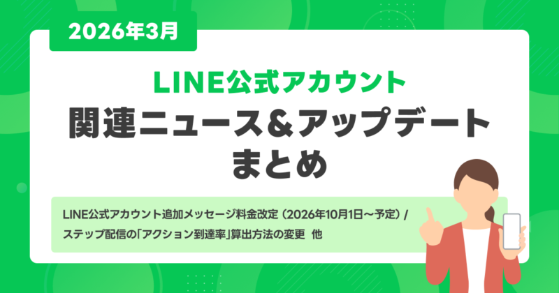 今月は、LINE公式アカウントの追加メッセージ料金改定の適用日が「2026年10月1日」に決定したほか、トークメニュー内にベーシックID/プレミアムIDを表示する仕様変更や、ステップ配信の「アクション到達率」算出方法の変更のお知らせなどがありました。